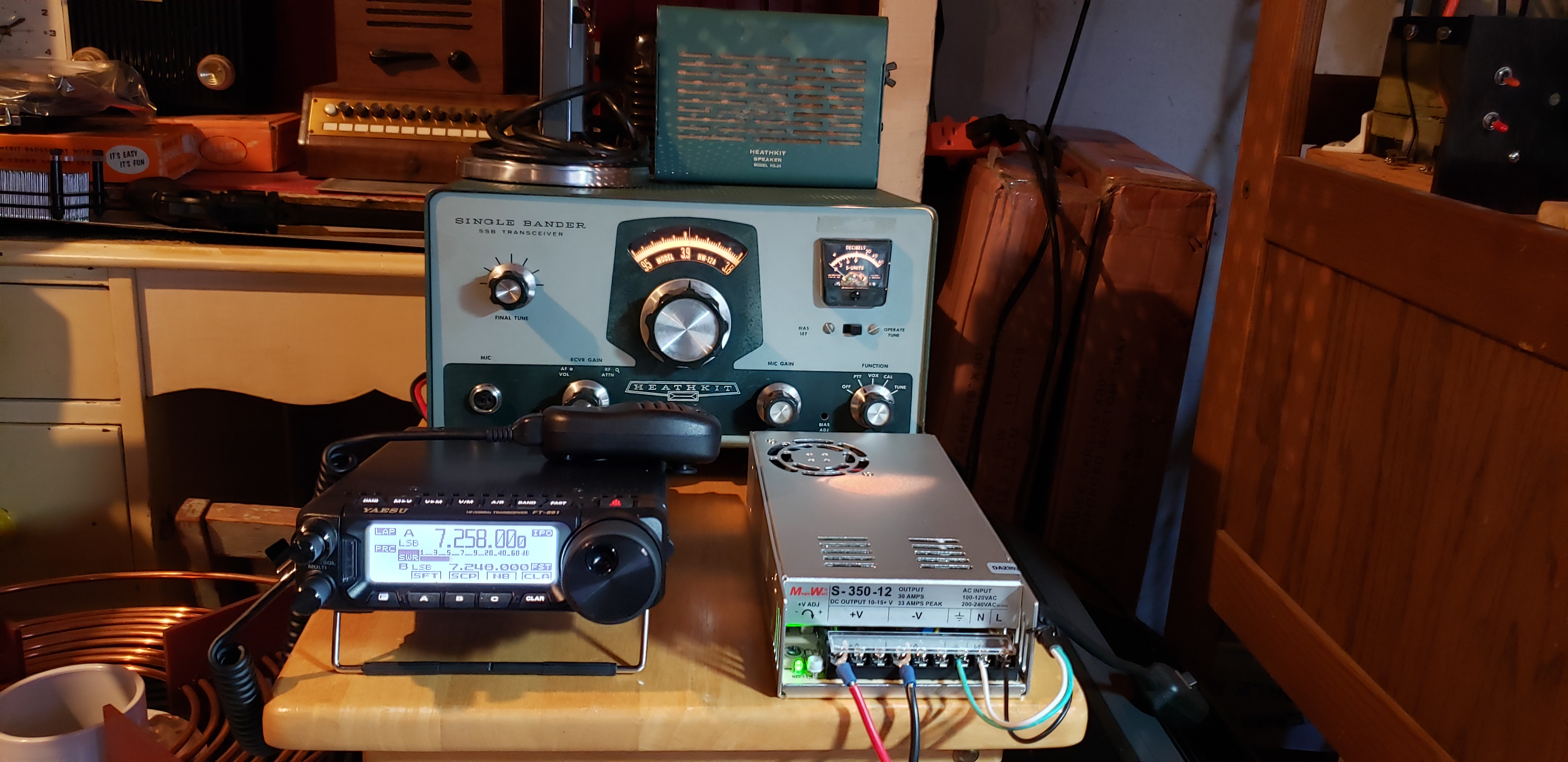 I put together some VHF/UHF equipment for the basement shack including a Kenwood TM-731A Dual Bander transceiver, Astron RS-12A power supply, Swan WM-6200 VHF wattmeter, and a copper J-pole dual-band antenna.
